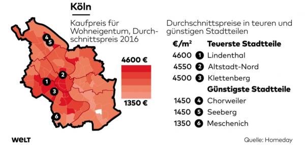 Medzi najdrahším Mníchovom (priemerná cena cca 7000 eur za meter štvorcový) a najlacnejším Kolínom nad Rýnom (priemerná cena asi 3100 eur za meter štvorcový) je poriadny rozdiel. Priemerné ceny v jednotlivých štvrtiach najlacnejšieho nemeckého veľkého mesta, Kolína nad Rýnom: